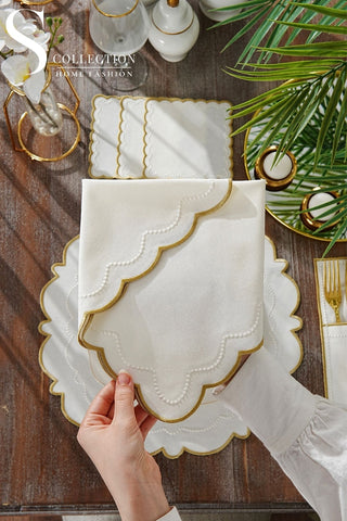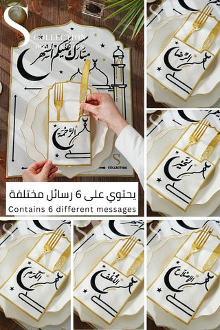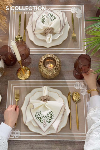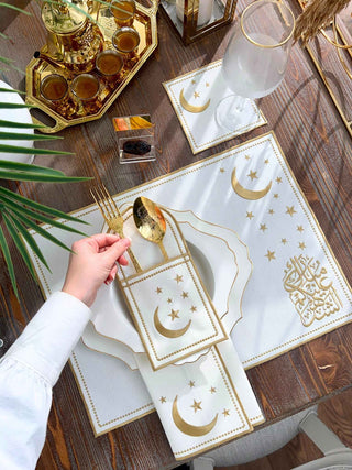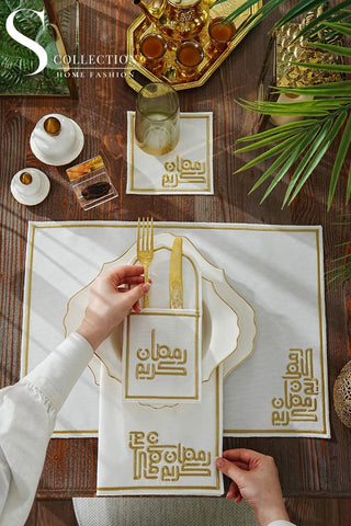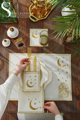 Ramadan Noor Design Placemat and Cutlery Pocket Set - Gold and Off White Embroidery - Waterproof Fabric - 12 pcs (6 Persons)