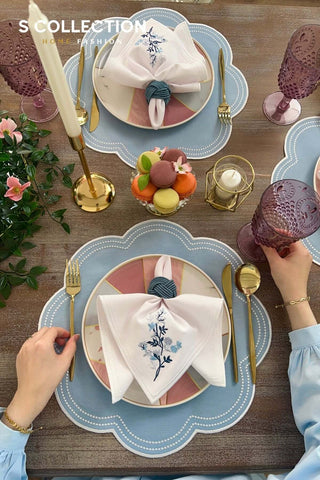 Floria Design Embroidered Placemat Set - Light Blue Colour Waterproof Fabric - 6 Persons - 18 Pcs.