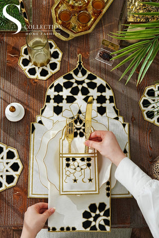Ramadan Dome Design Black and Gold Placemat Set - Waterproof Fabric - 6 Persons - 24 Pcs. Full Set