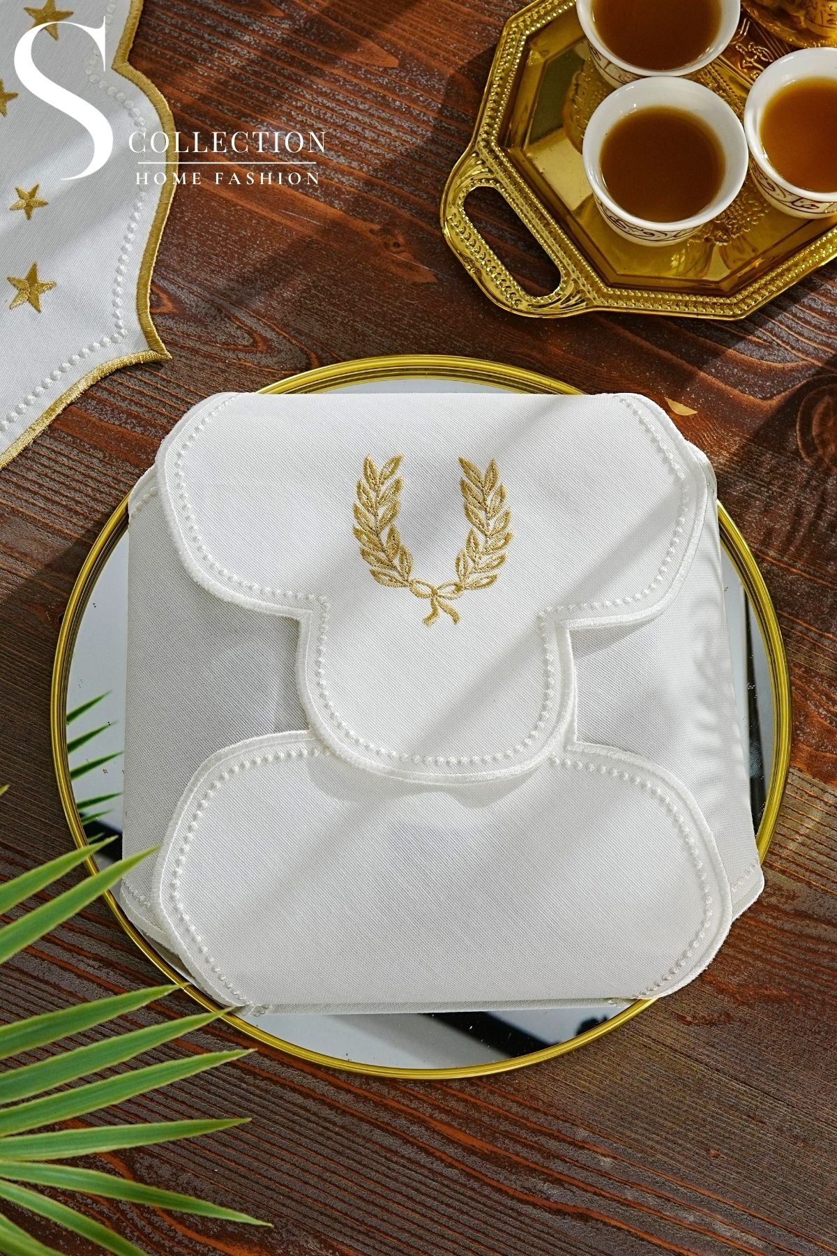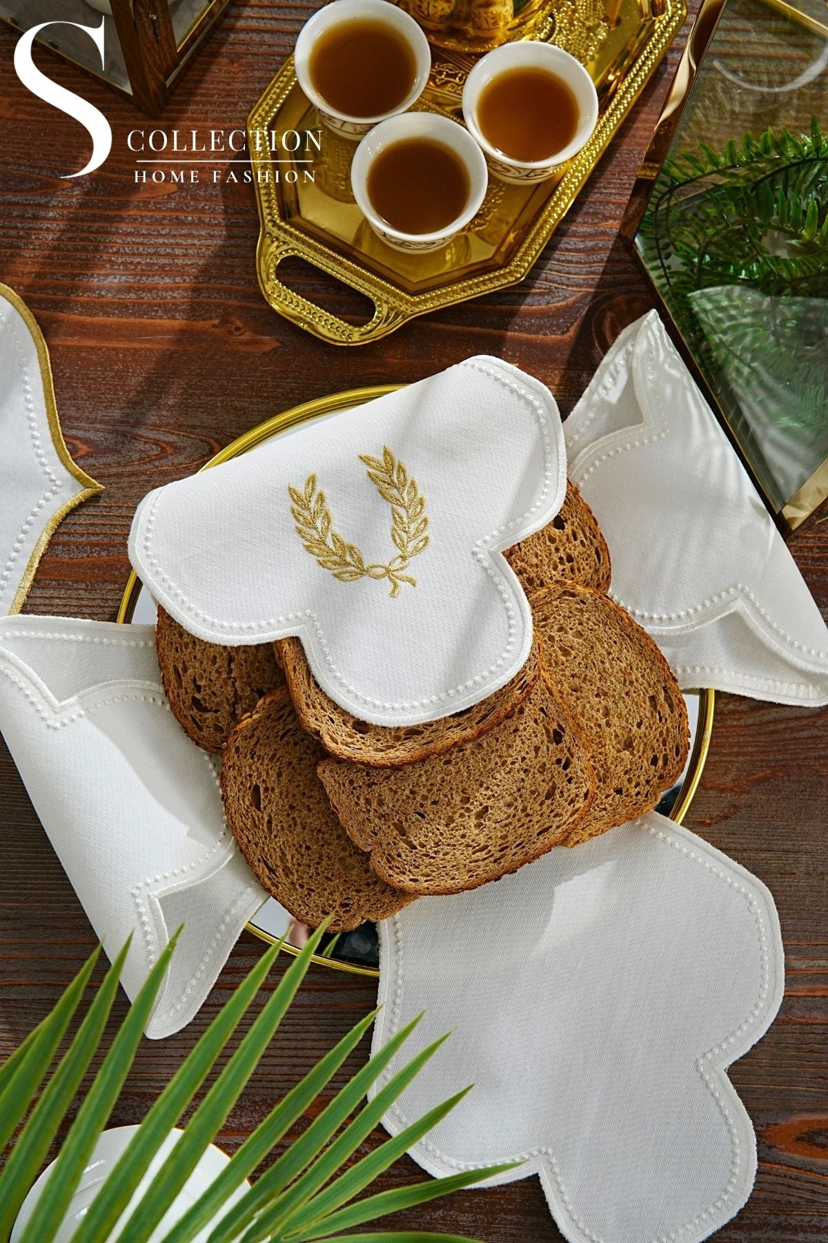 Laurel Wreath Design Bread Basket Napkin - Waterproof Fabric - Gold and Off White Embroidered