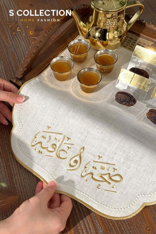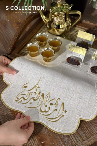 Al-Barakah Design Tray Cover - %100 Linen Fabric - Gold Embroidered