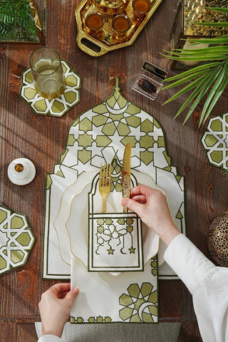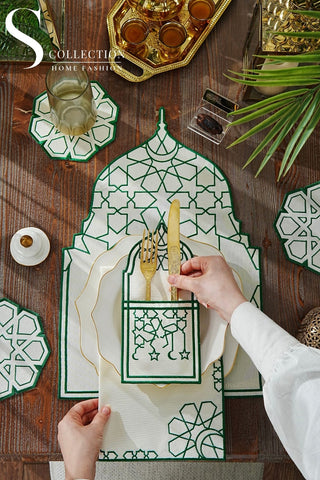 Ramadan Dome Design Green and Off White Placemat Set - Waterproof Fabric - 6 Persons - 24 Pcs. Full Set