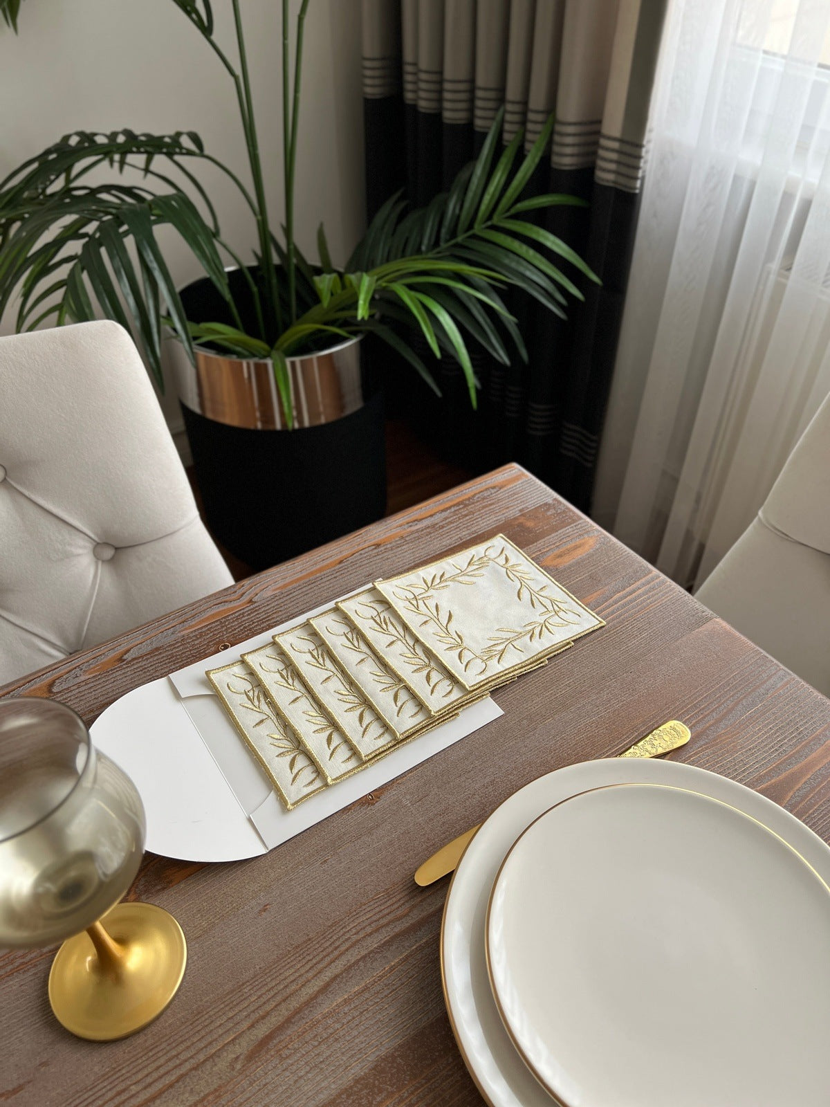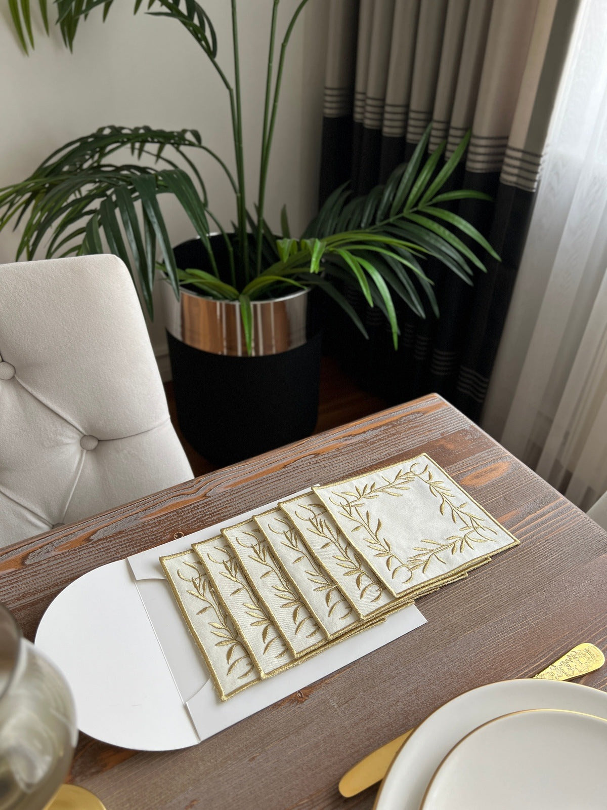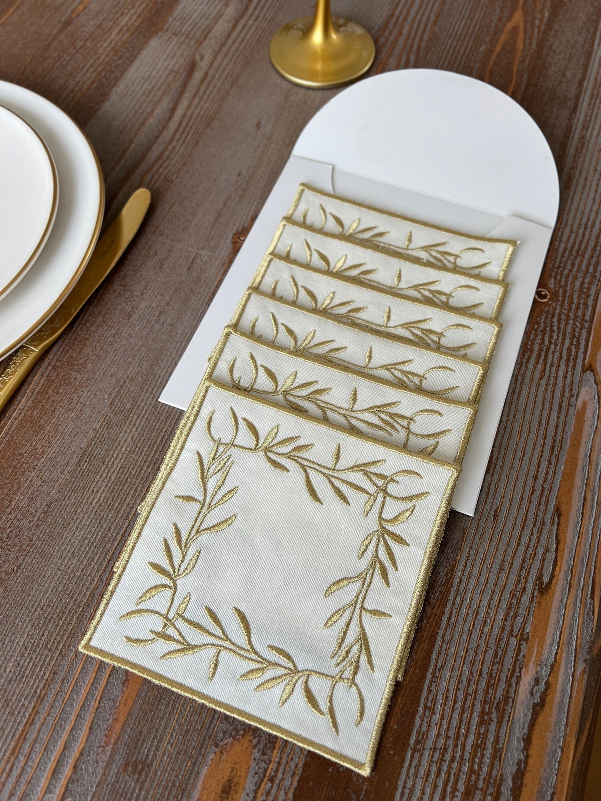 Flower Design Cocktail Napkin - Waterproof Fabric - Shine Gold Embroidered
