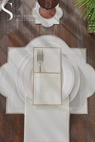 Milan Off White and Cappuccino Design Placemat Set - Waterproof Fabric - 6 Persons - 24 Pcs. Full Set
