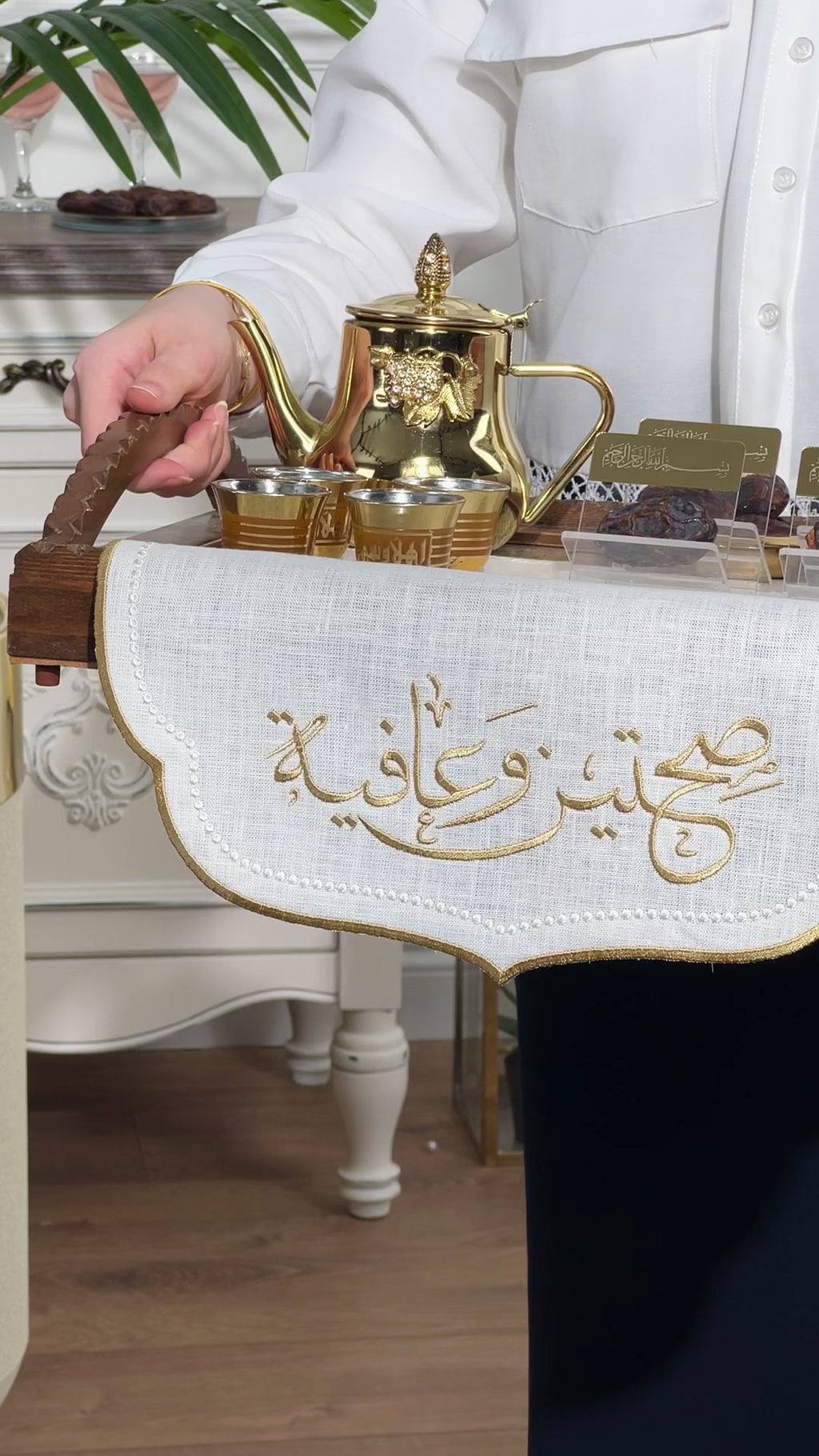 Sahtain wa Afia Design Tray Cover - %100 Linen Fabric - Gold Embroidered