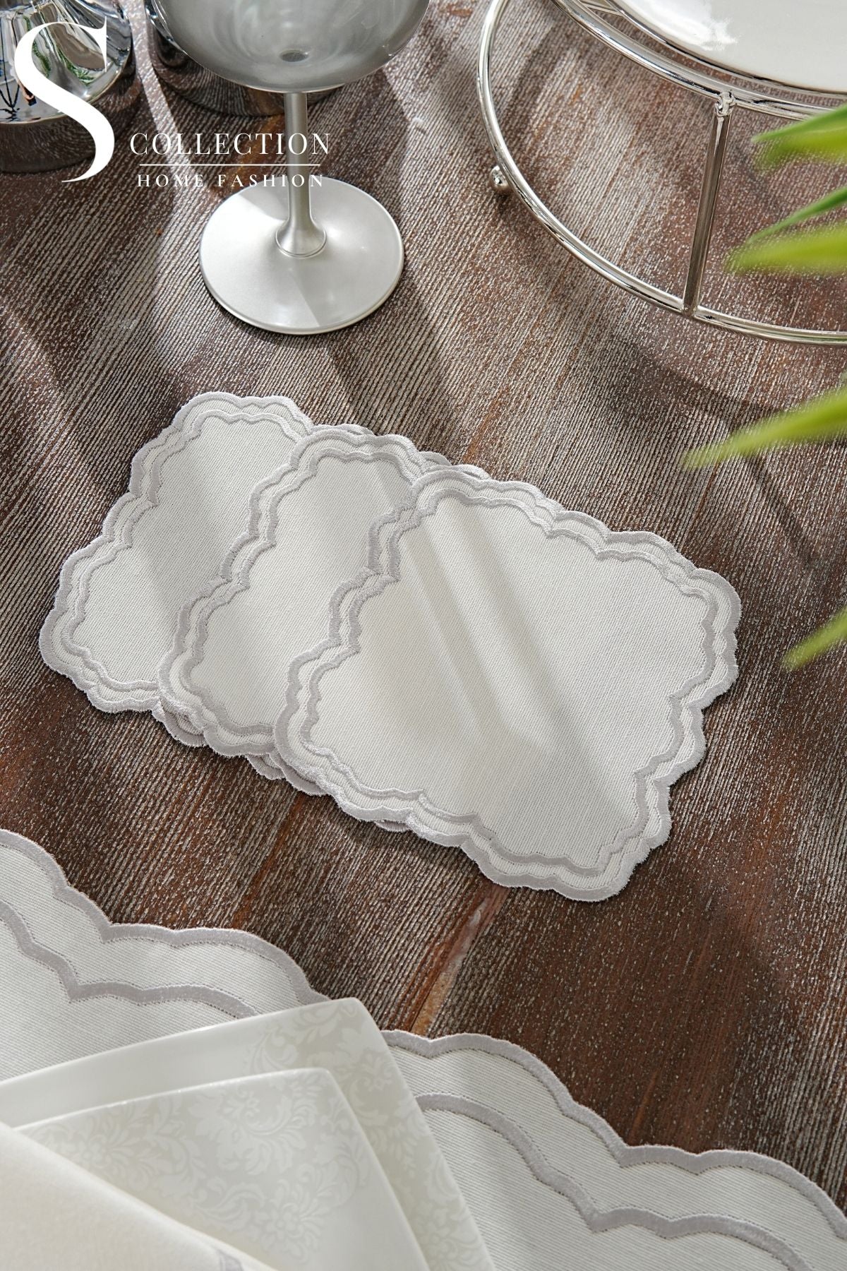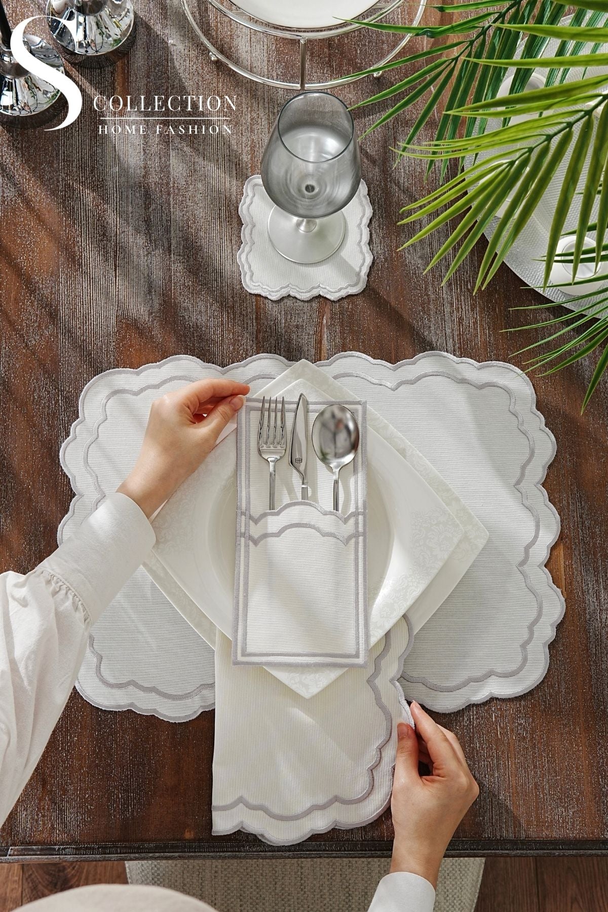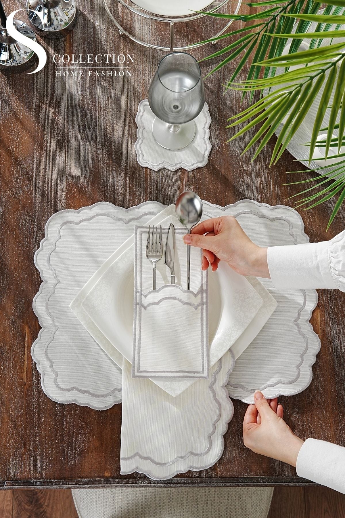 Gabriel Silver Design Placemat Set - Waterproof Fabric - 6 Persons - 24 Pcs. Full Set