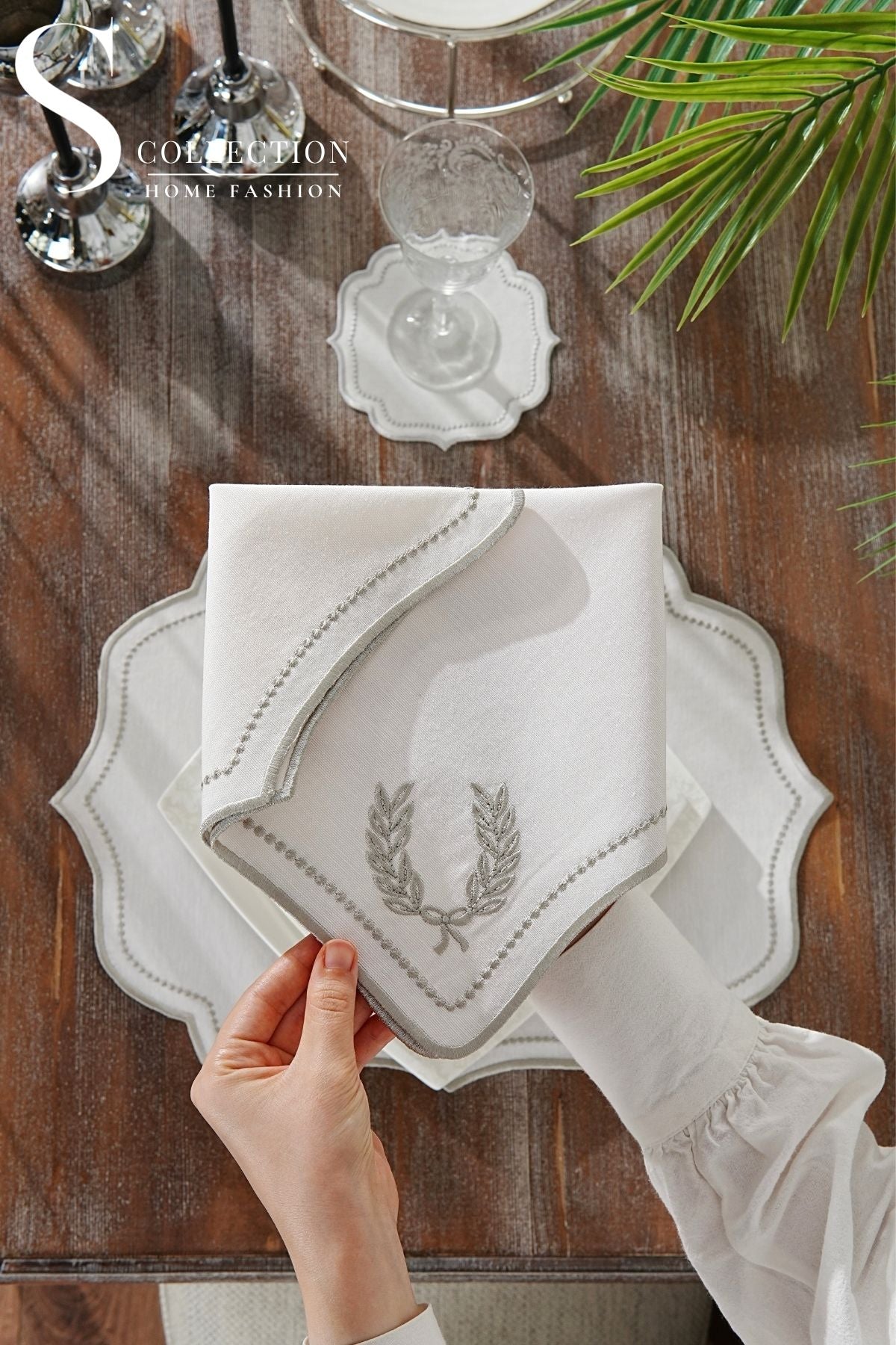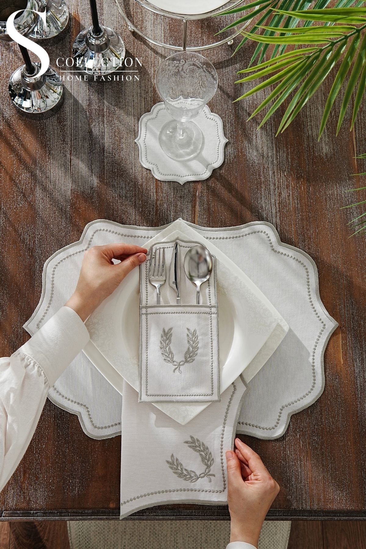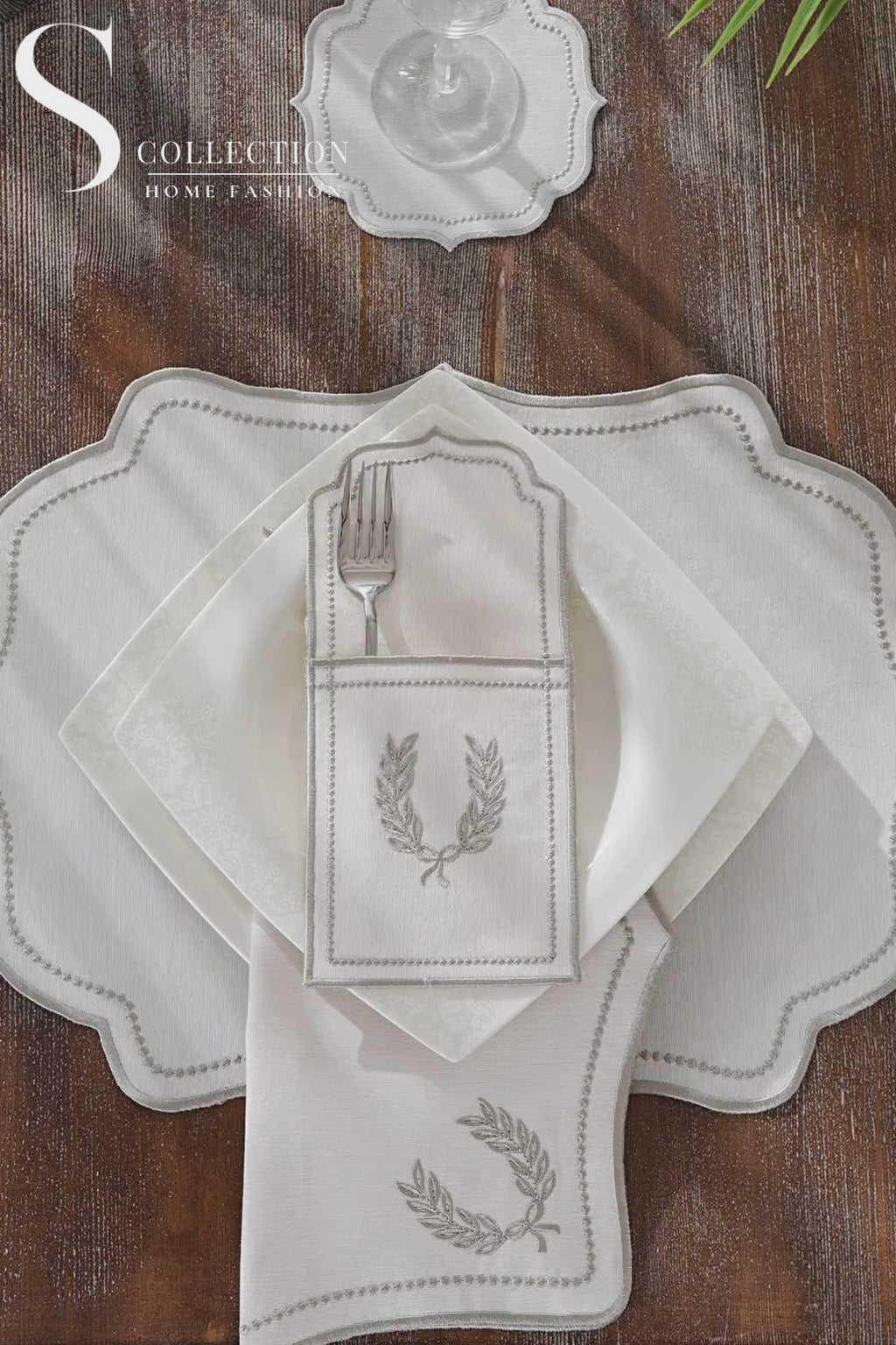 Laurel Wreath Silver Design Placemat Set - Waterproof Fabric - 6 Persons - 24 Pcs. Full Set