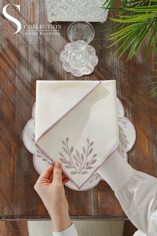 Leafy Allure Off White Design Placemat Set - Waterproof Fabric - 6 Persons - 24 Pcs. Full Set