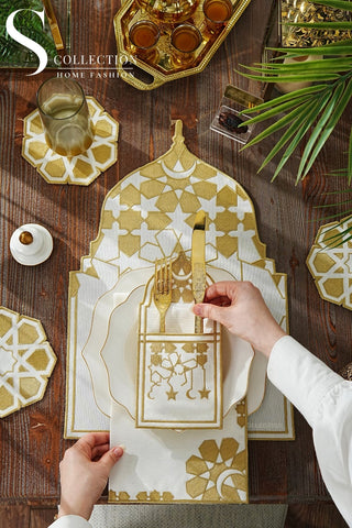 Ramadan Dome Design Gold and Off White Placemat Set - Waterproof Fabric - 6 Persons - 24 Pcs. Full Set