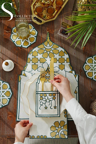 Ramadan Dome Design Green and Gold Placemat Set - Waterproof Fabric - 6 Persons - 24 Pcs. Full Set