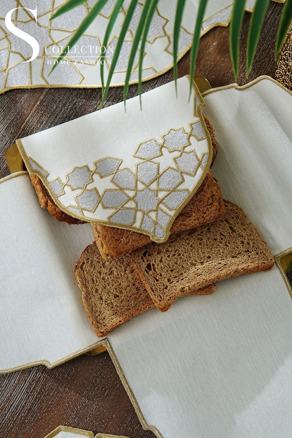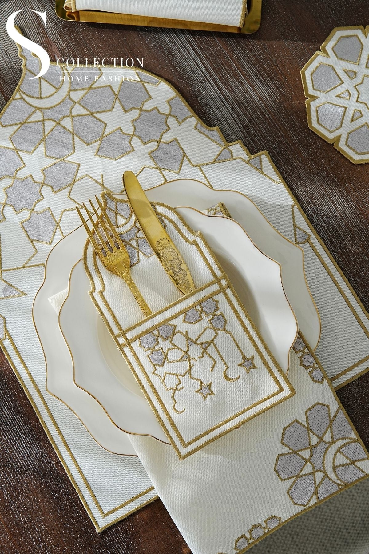 Ramadan Dome Design Silver and Gold Full Placemat Set - With Bread Basket Napkin and Runner - 6 Persons - 26 Pcs.