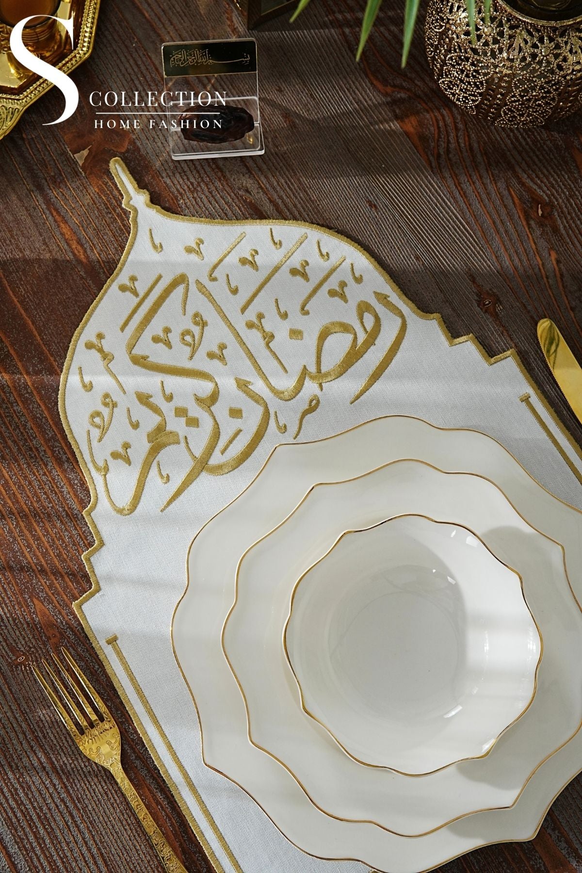 Ramadan Qubba Design Gold Placemat - Waterproof Fabric - 12 Persons - 12 Pcs.