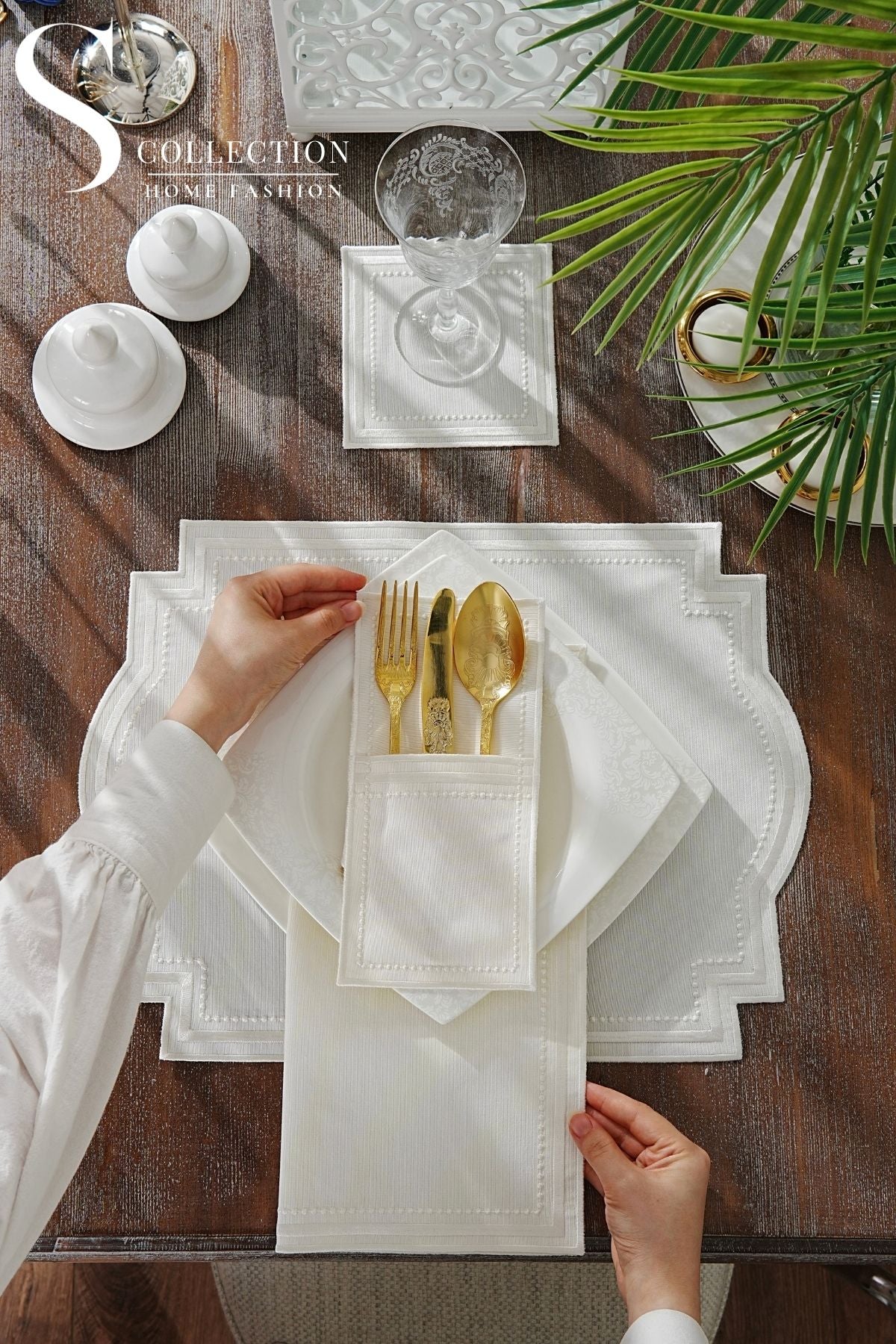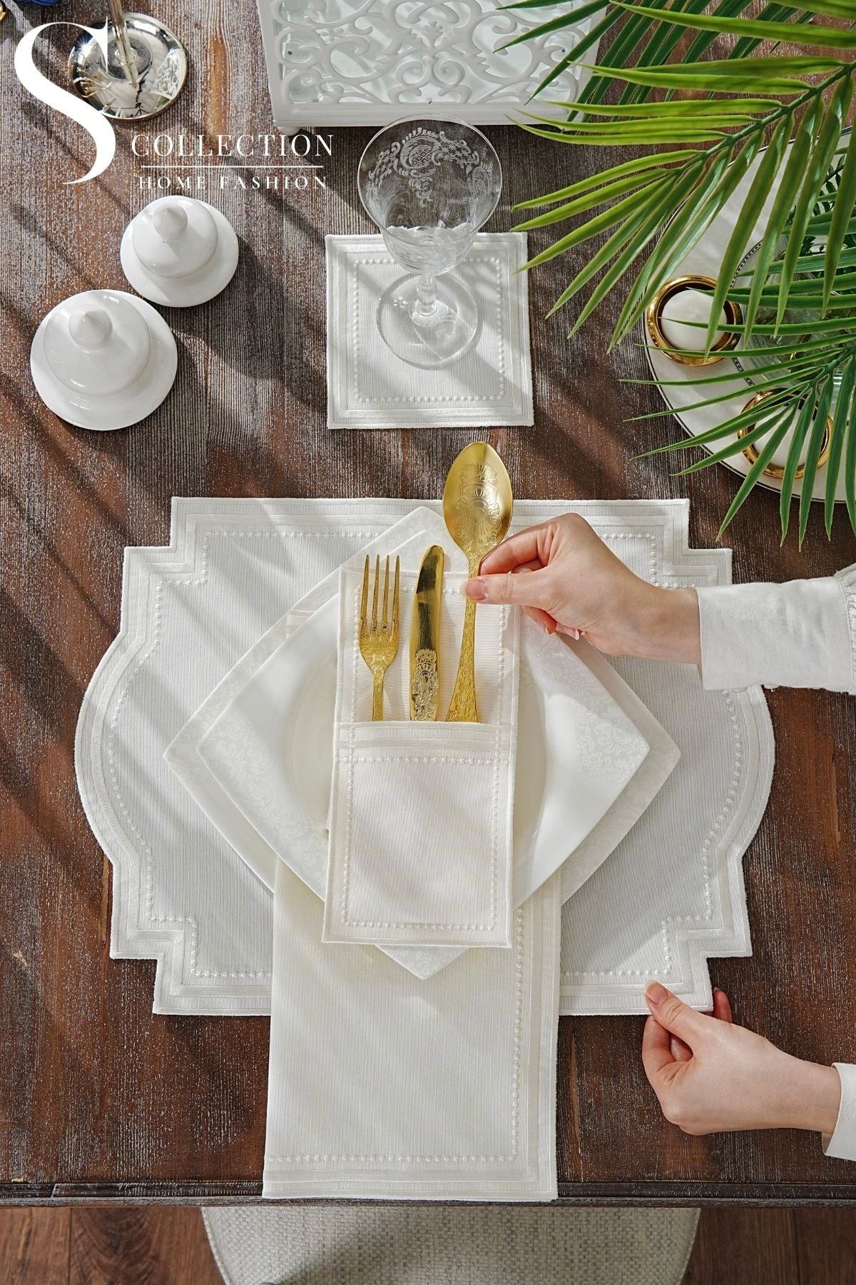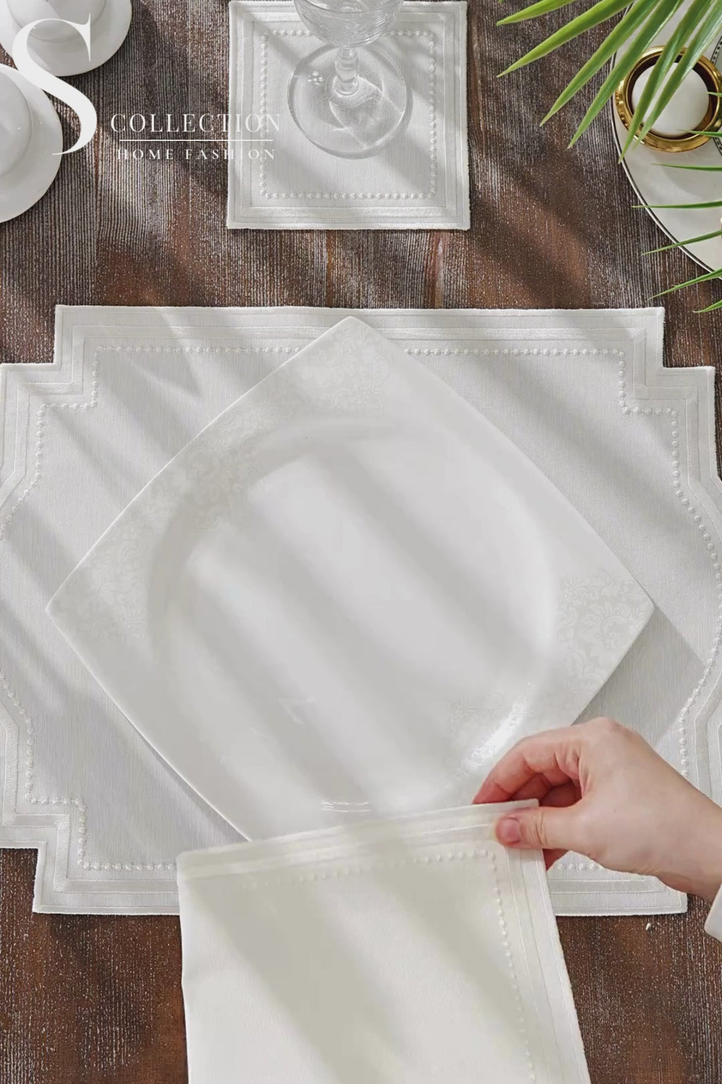 Graceful Off White Design Placemat Set - Waterproof Fabric - 6 Persons - 24 Pcs. Full Set