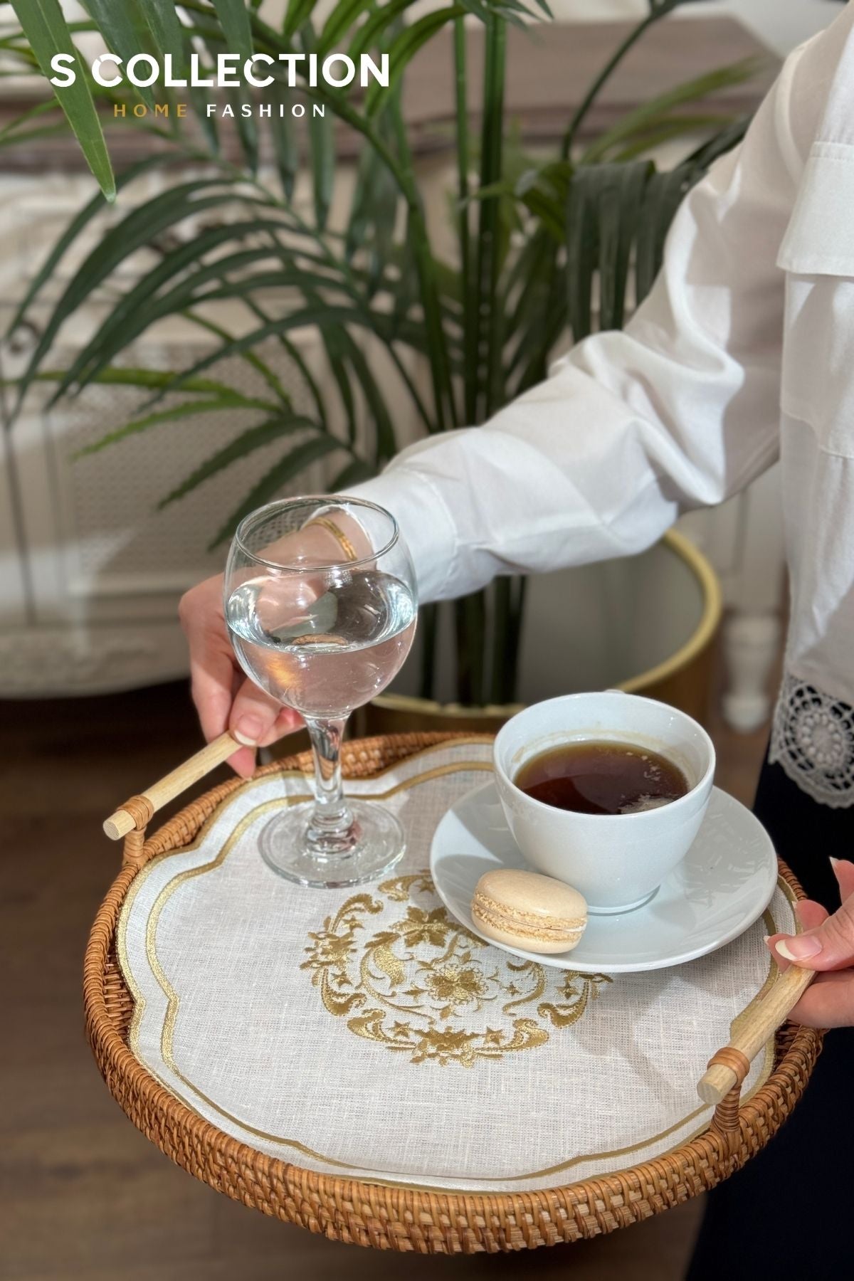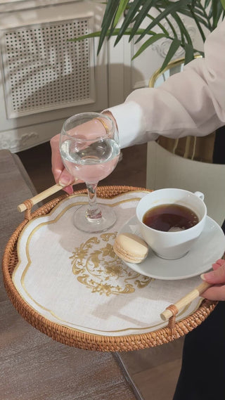 Elegant and handcrafted tray covers made from premium-quality linen with intricate embroidery, perfect for adding a touch of sophistication to your coffee or similar presentations for your guests.