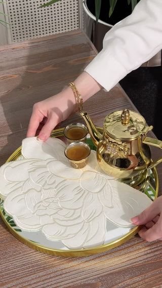Elegant and handcrafted tray covers made from premium-quality linen with intricate embroidery, perfect for adding a touch of sophistication to your coffee or similar presentations for your guests.