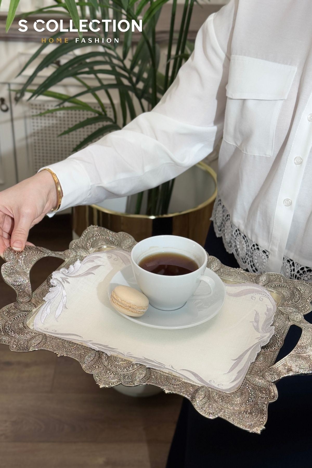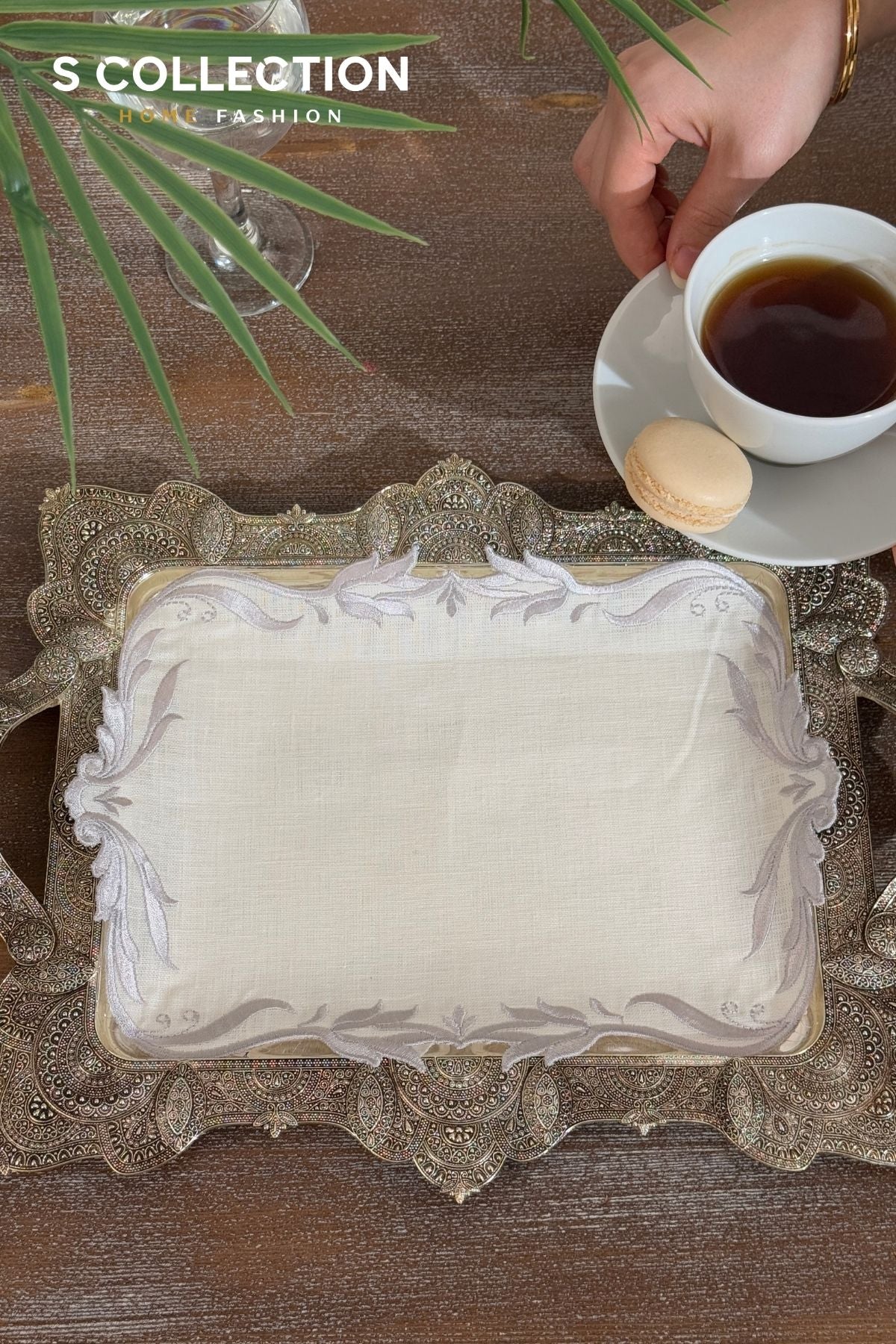 Elegant and handcrafted tray covers made from premium-quality linen with intricate embroidery, perfect for adding a touch of sophistication to your coffee or similar presentations for your guests.