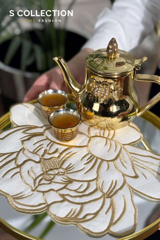 Tulip Design Tray Cover - % 100 Linen Fabric - Shine Gold Embroidered