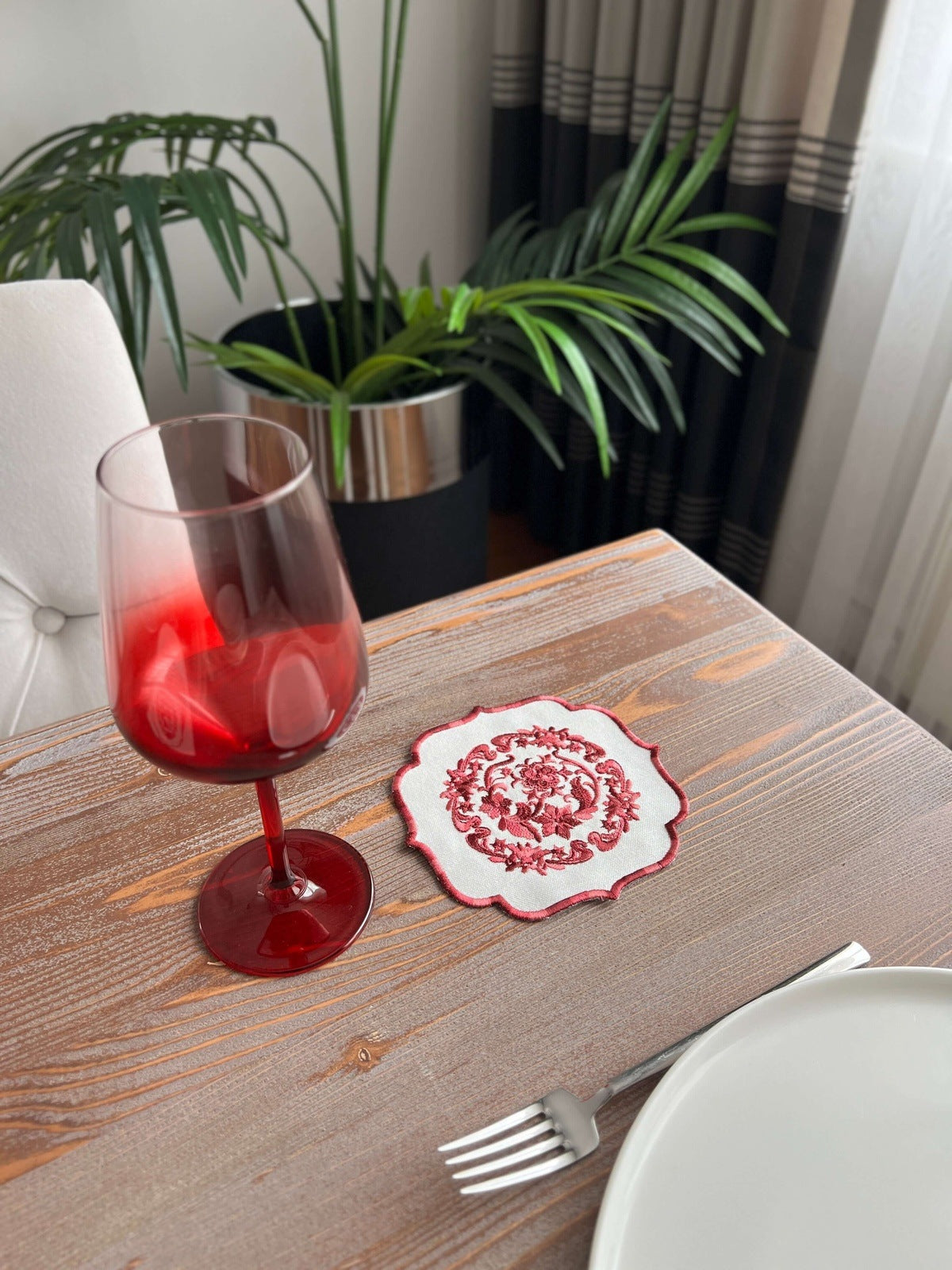 Bouquet Design Cocktail Napkin - Waterproof Fabric - Burgundy Embroidered