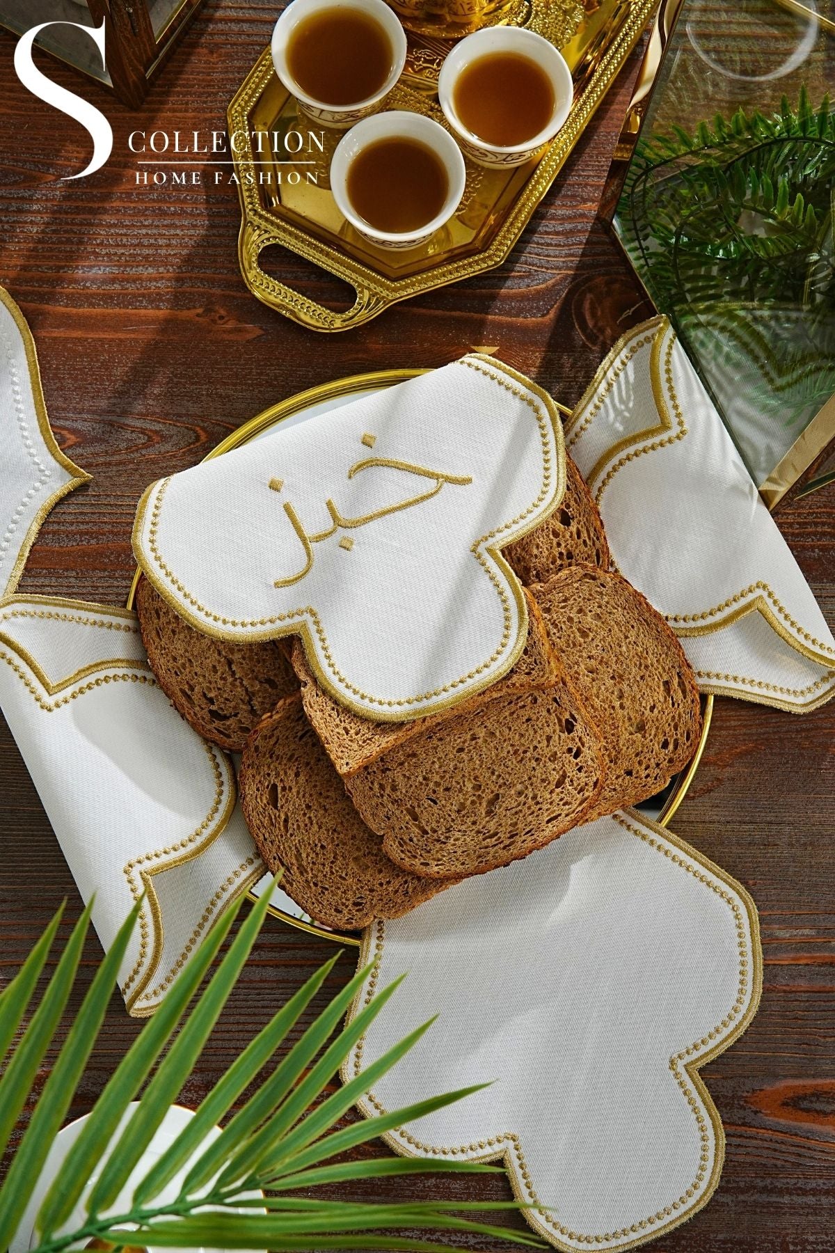 Cloud Veil Arabic Edition Bread Basket Napkin - Waterproof Fabric - Gold Embroidered