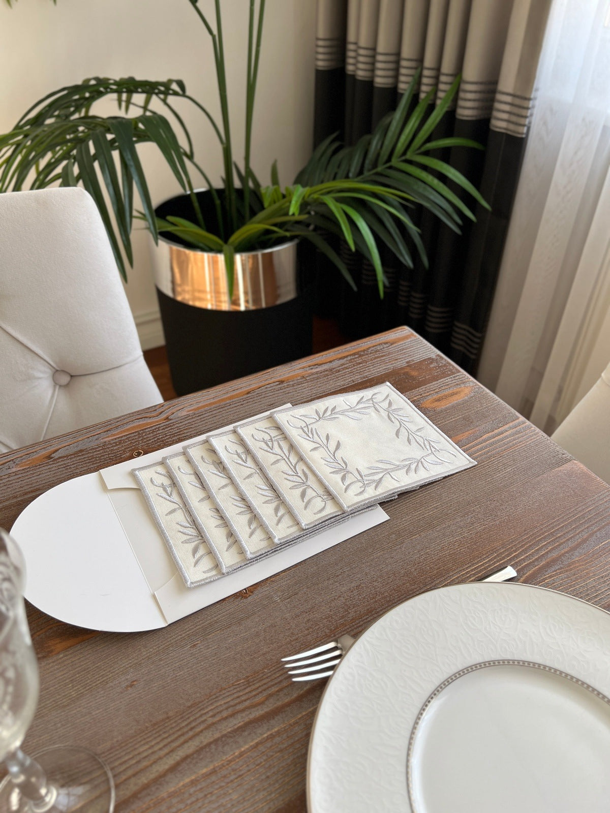 Flower Design Cocktail Napkin - Waterproof Fabric - Silver Embroidered