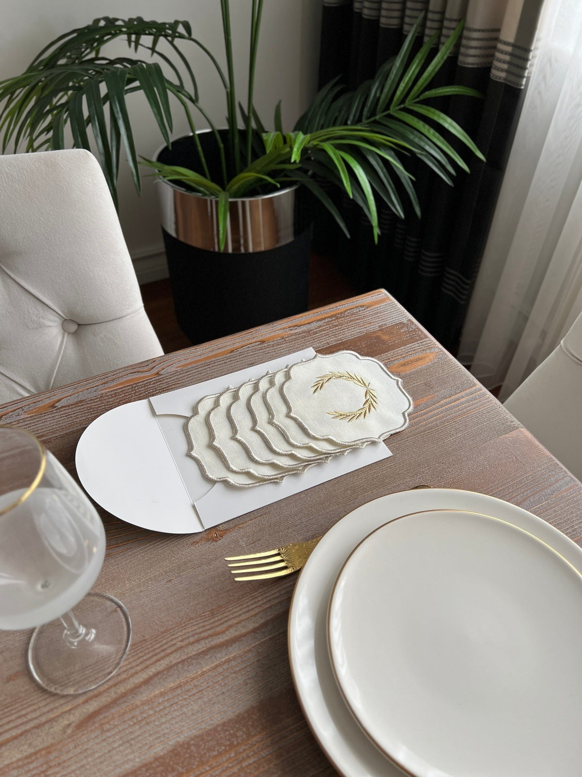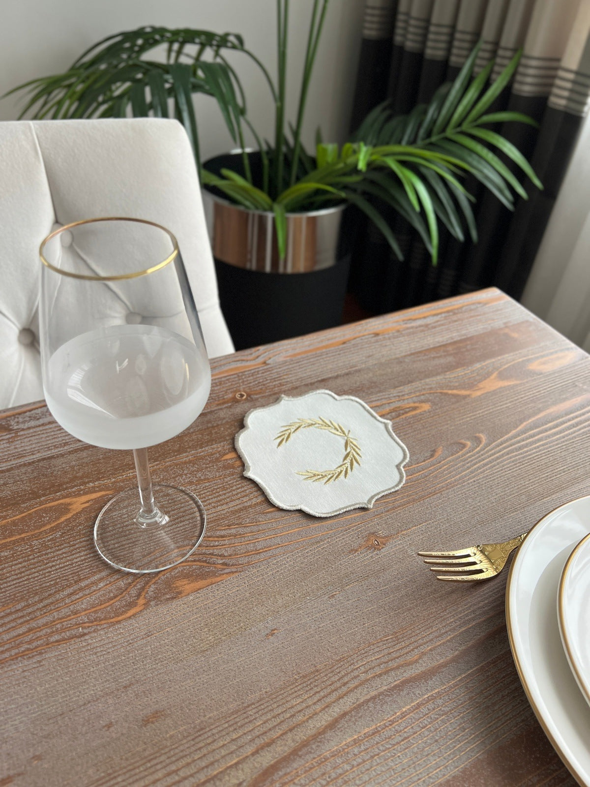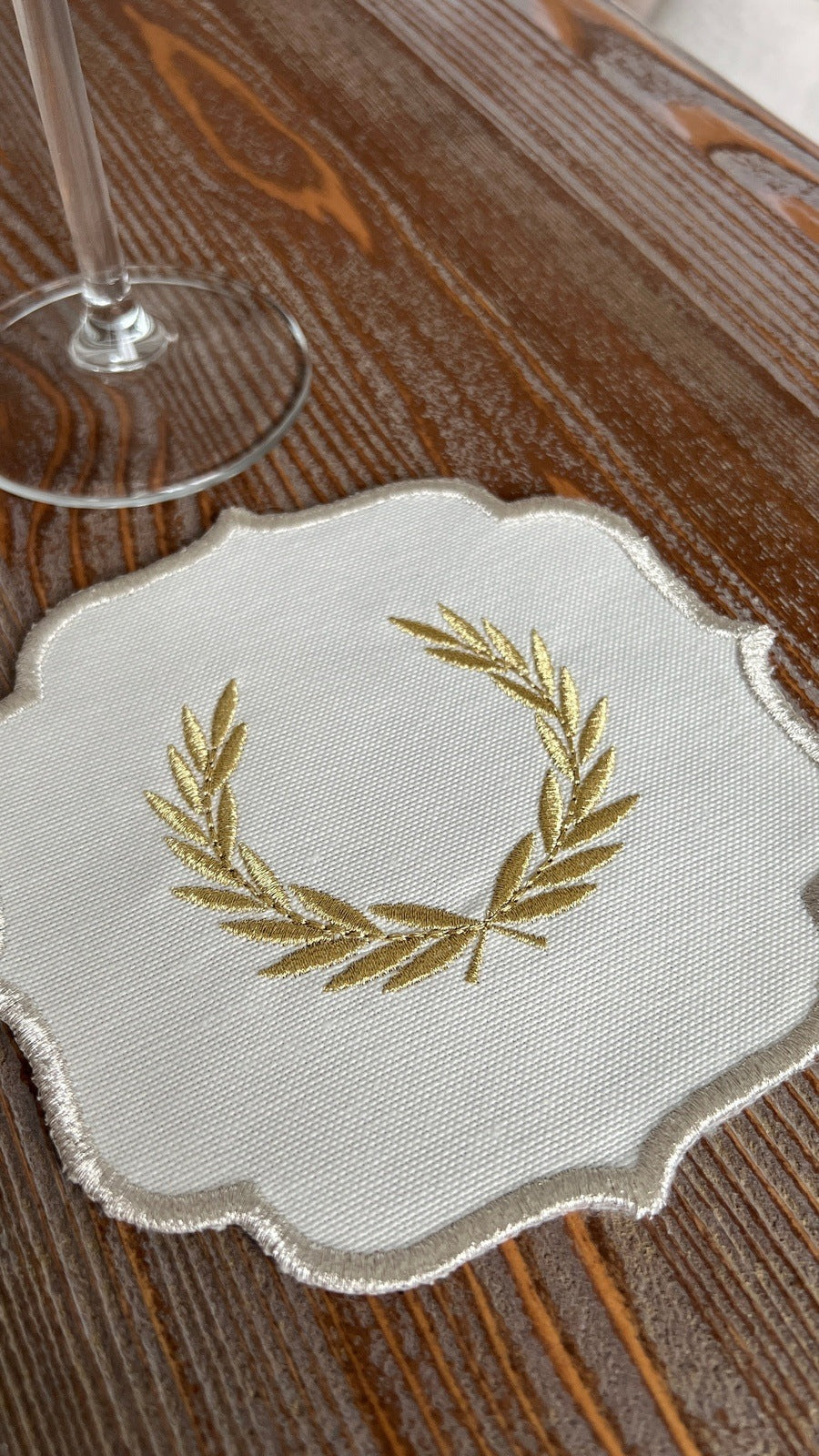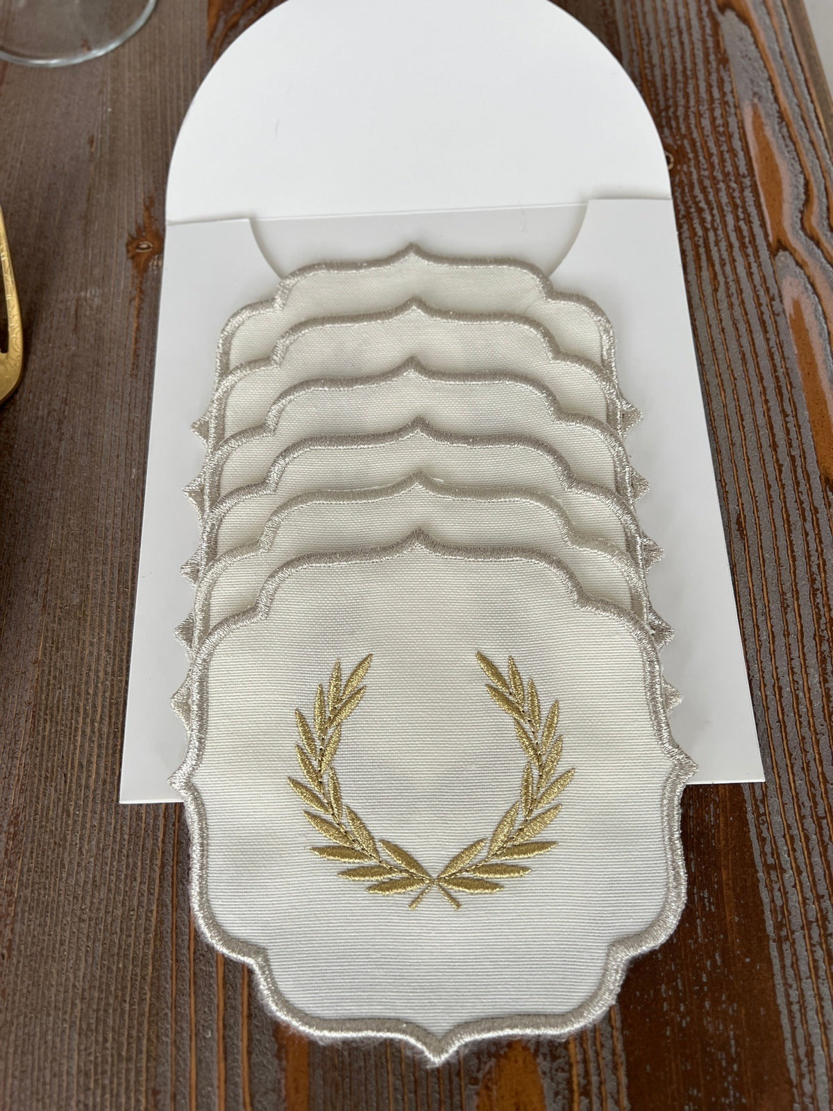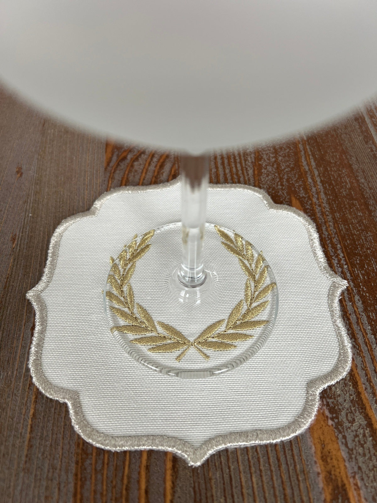 Laurel Wreath Shine Gold Design Cocktail Napkin - Waterproof Fabric - Shine Silver Border Embroidered