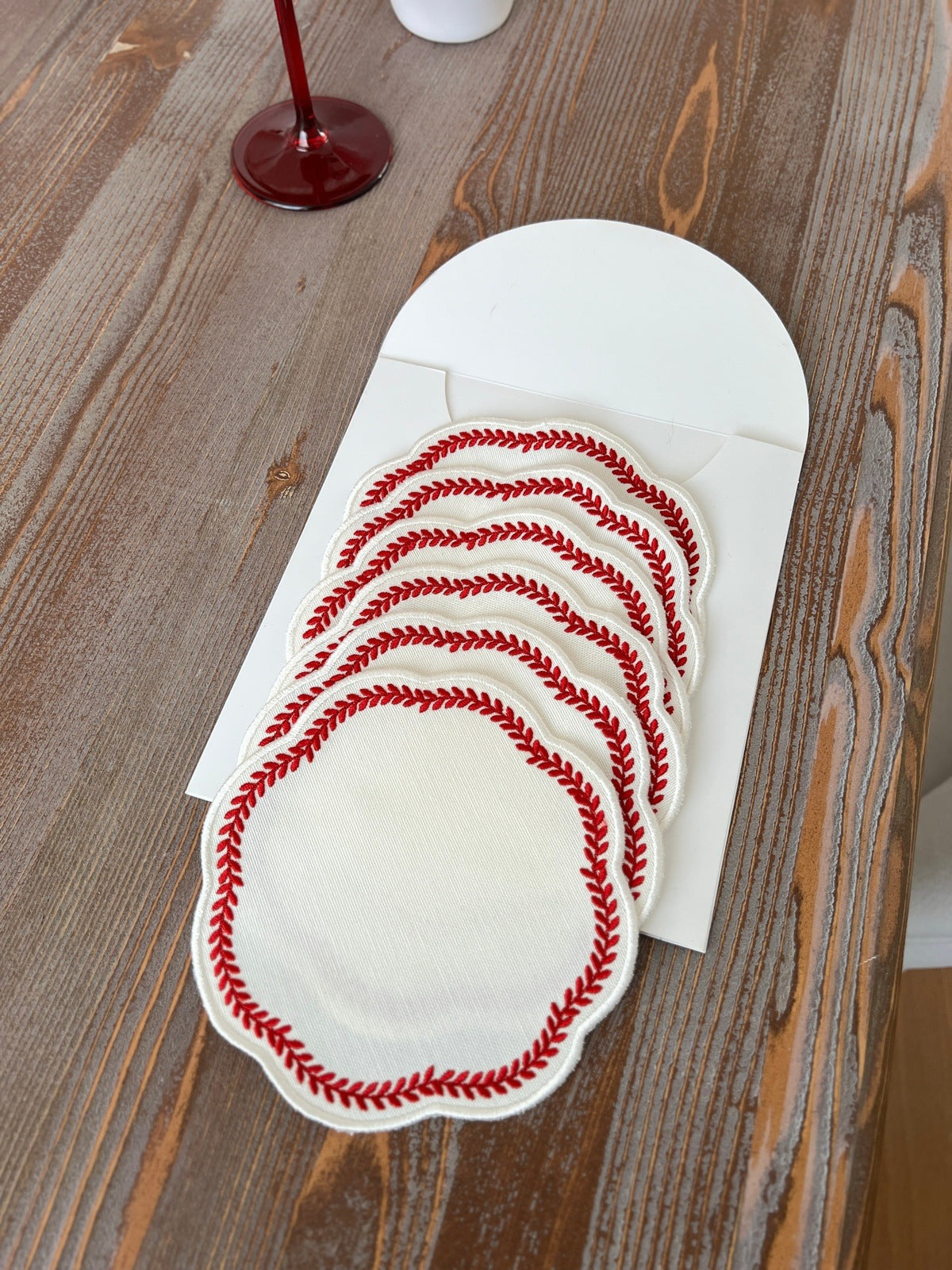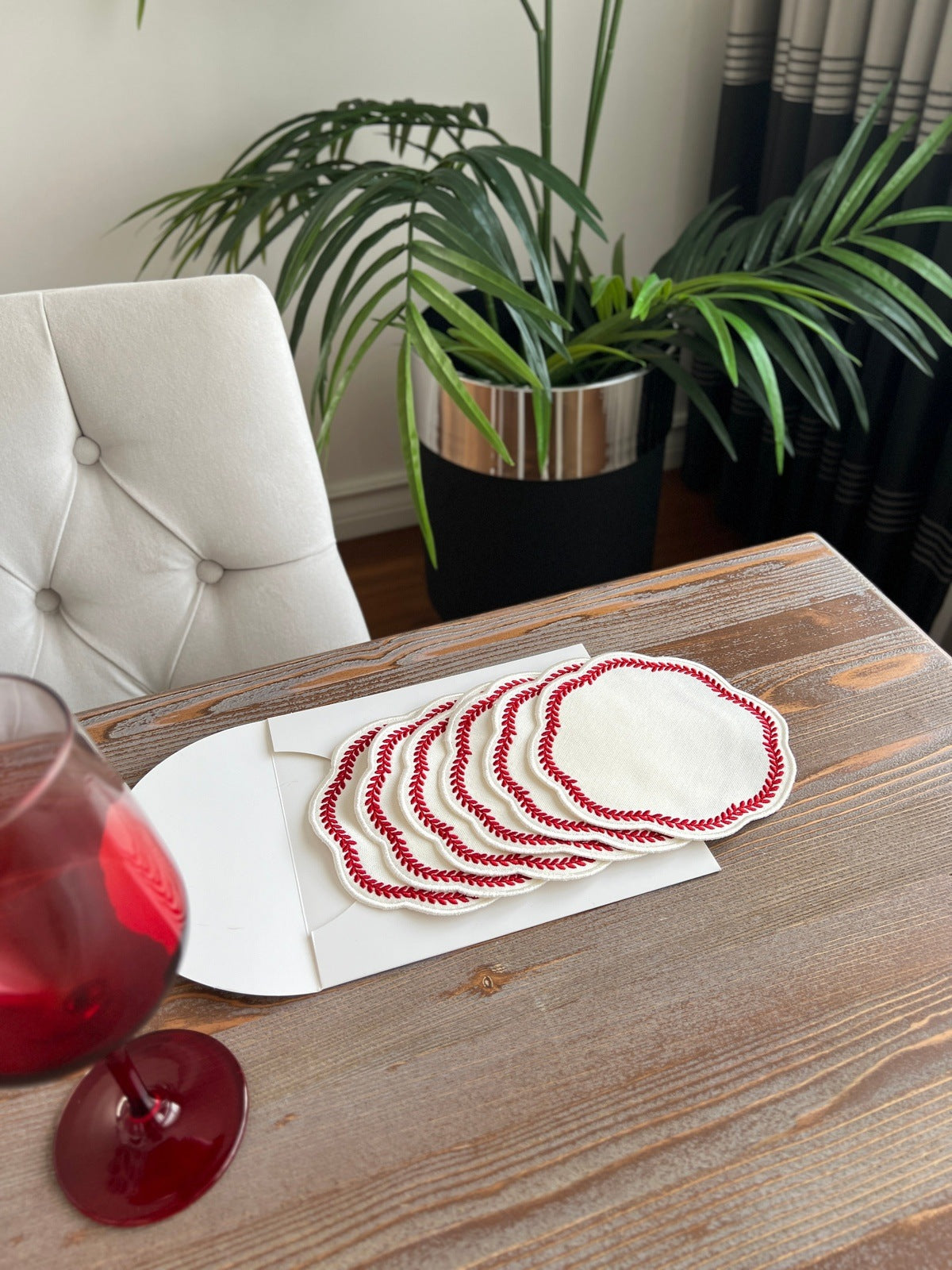 Leafy Allure Design Cocktail Napkin - Waterproof Fabric - Red Embroidered