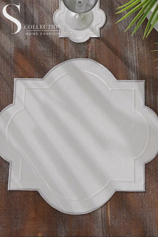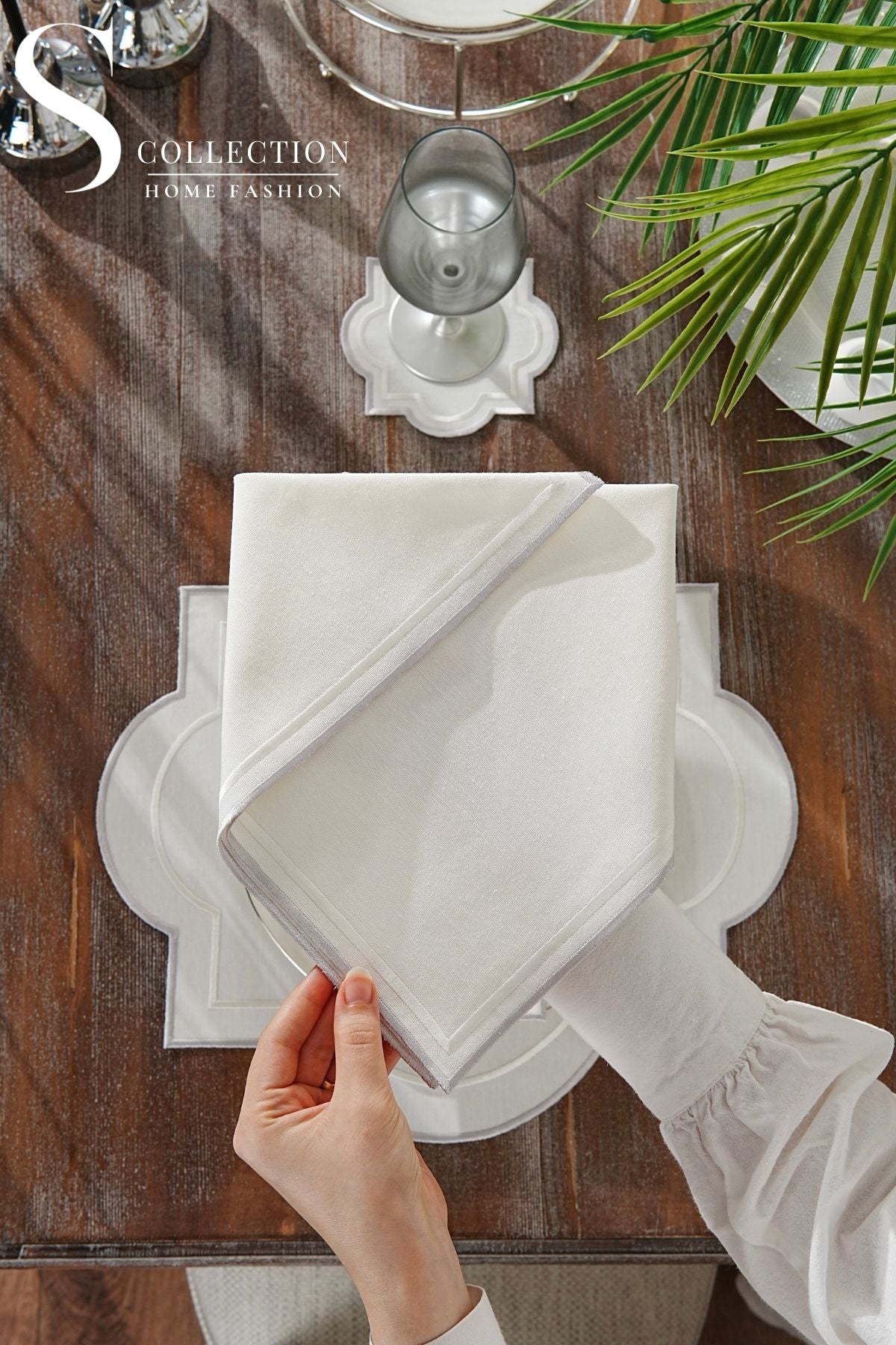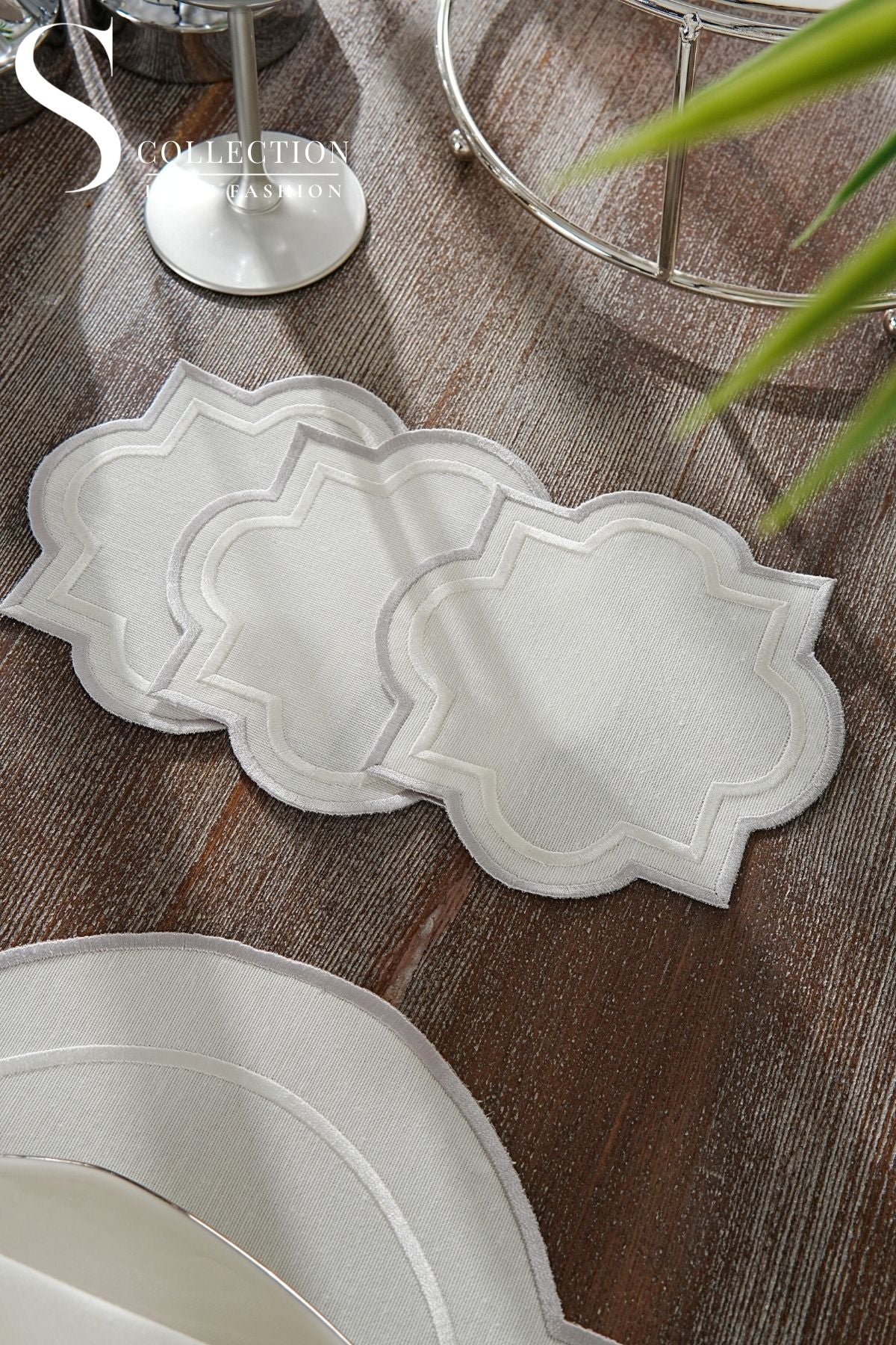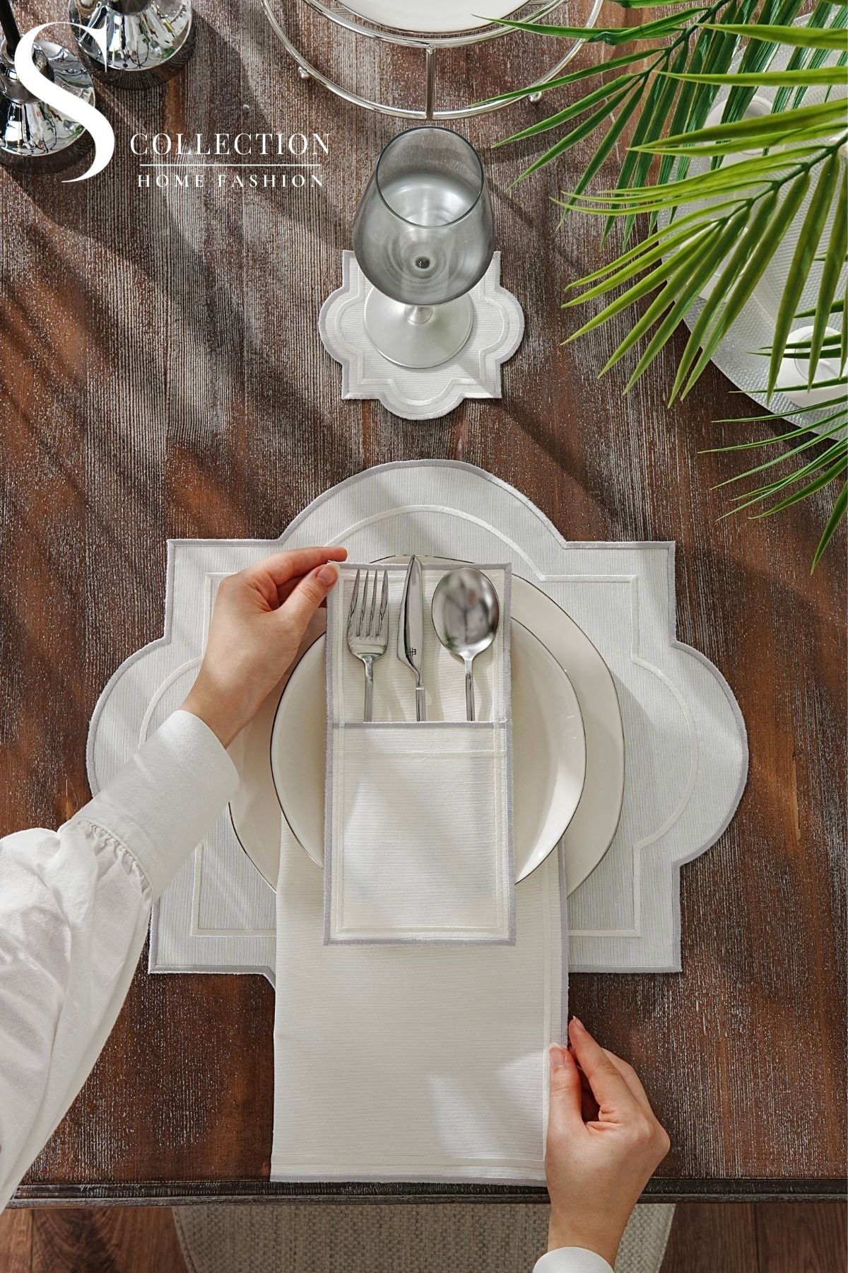 Milan Silver and Off White Design Placemat Set - Waterproof Fabric - 6 Persons - 24 Pcs. Full Set