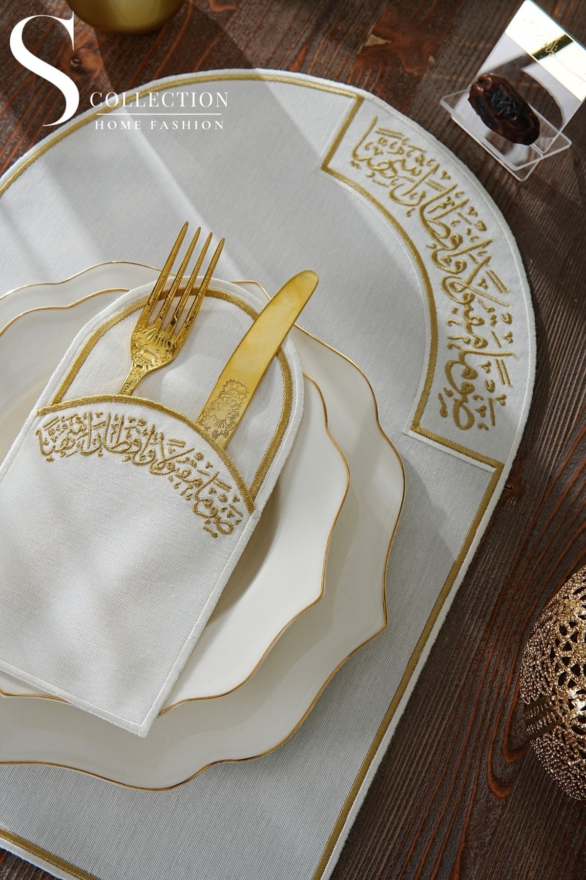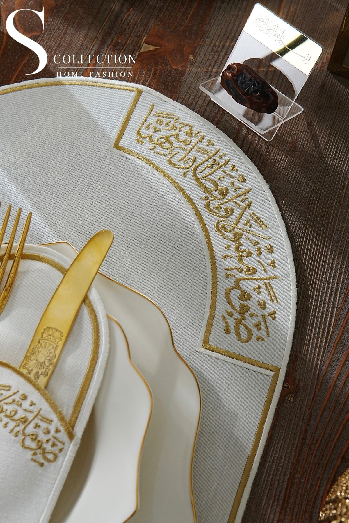 Ramadan Noor Design Placemat and Cutlery Pocket Set - Gold and Off White Embroidery - Waterproof Fabric - 12 pcs (6 Persons)